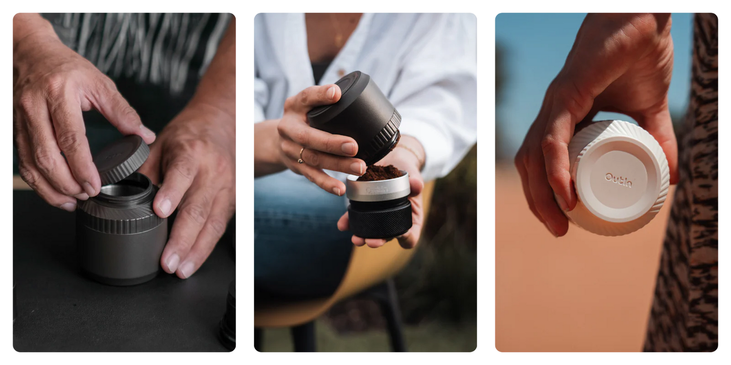 A OutIn Fino inclui um funil dosador e uma tampa para o copo coletor, permitindo armazenar o café já moído, pronto para o preparo — basta rosquear a tampa e levar com você.